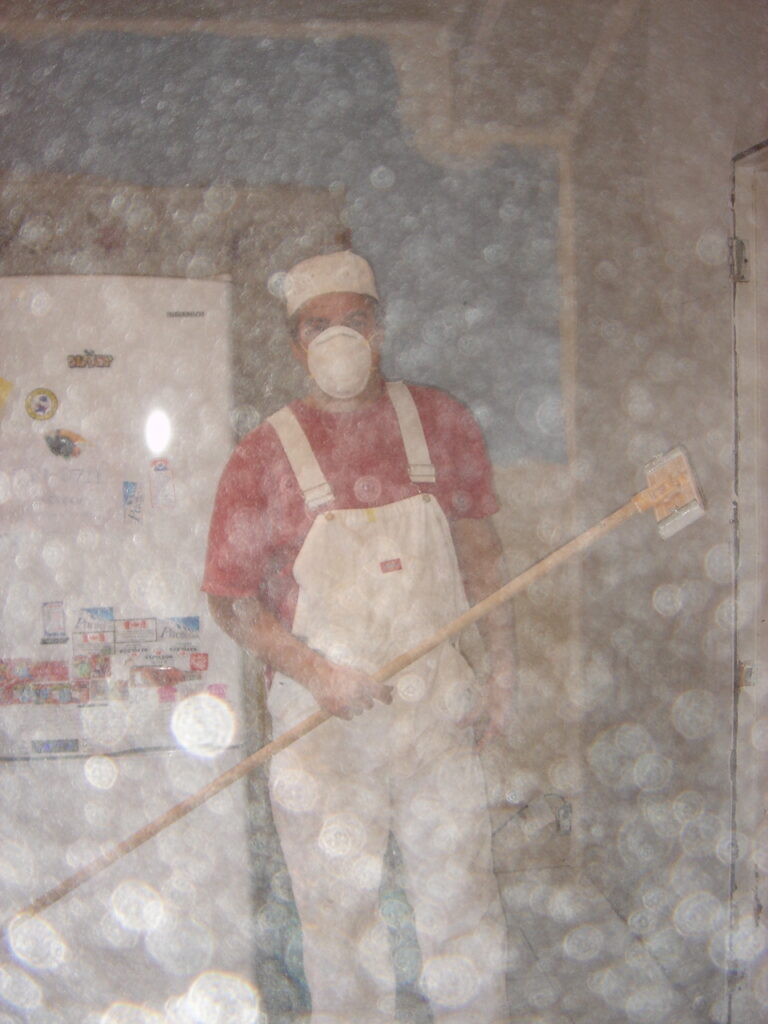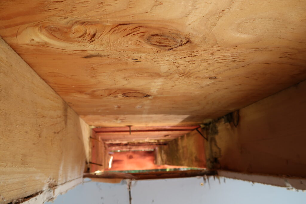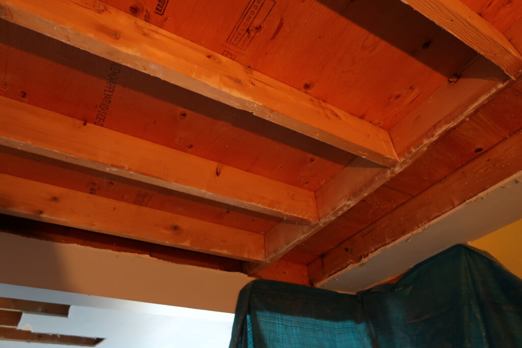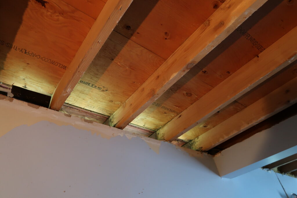 Removing drywall carefully to inspect inner ceiling joist