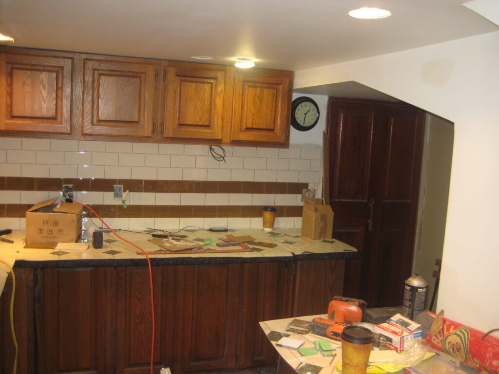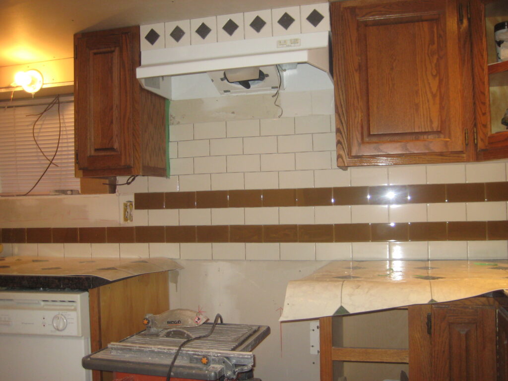 Installed backsplash under upper cabinets.